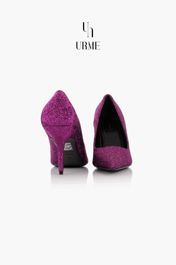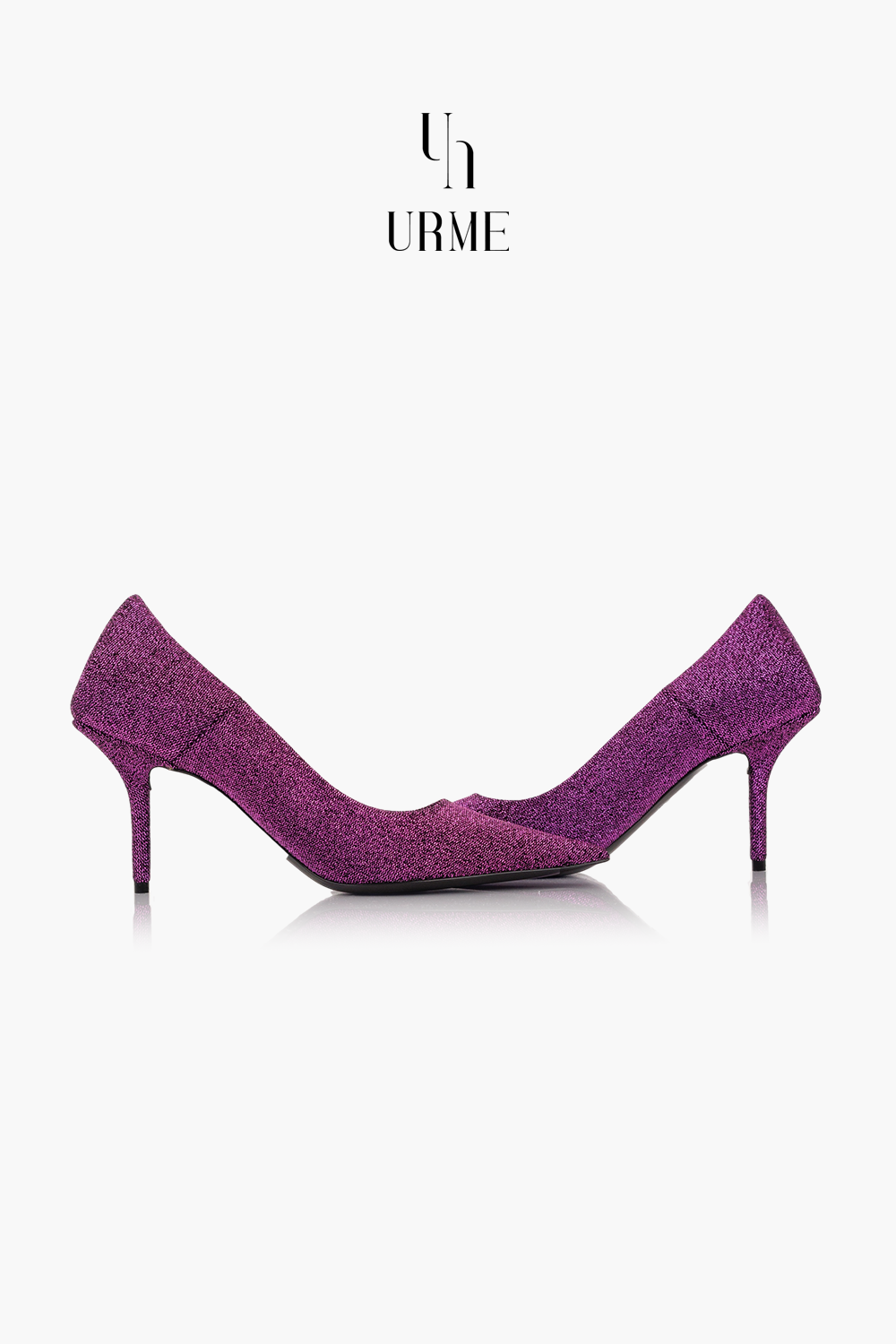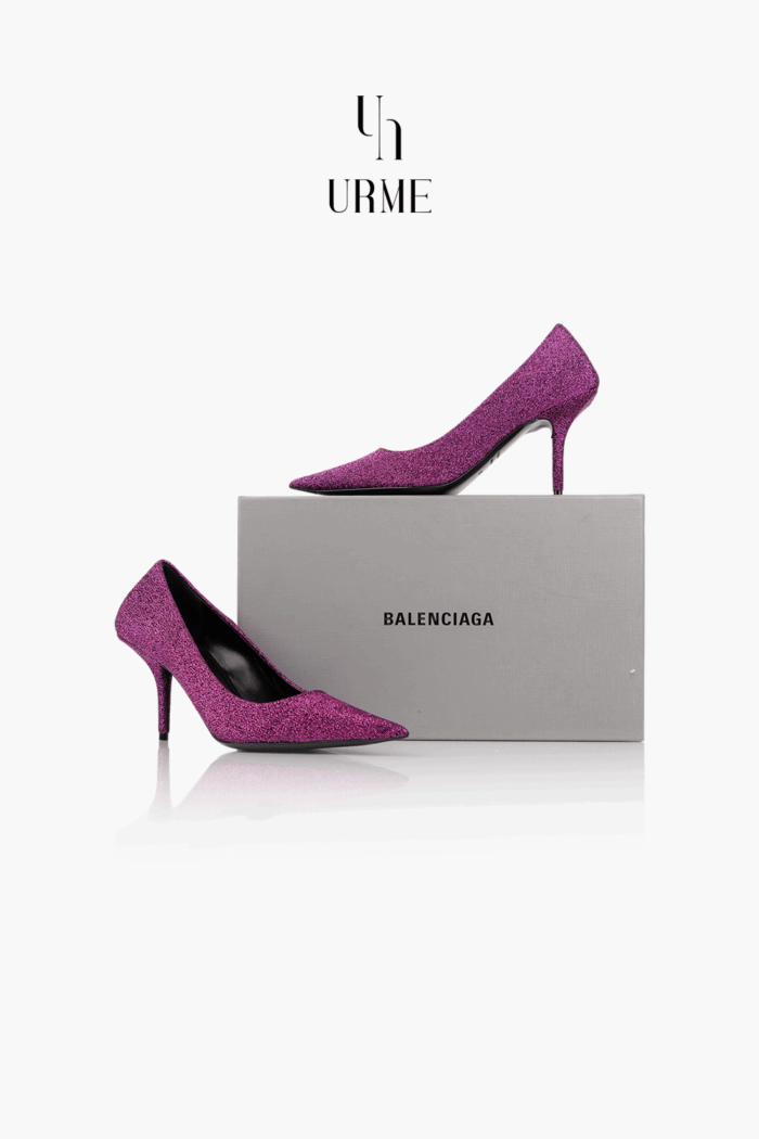 Balenciaga’s iconic Knife Pump in glittered lamé delivers a razor-sharp pointed toe and a sleek 80 mm stiletto. The vivid purple sparkle fabric wraps the foot over a leather-lined interior, creating a striking evening pump that shines from every angle.
