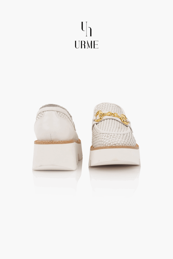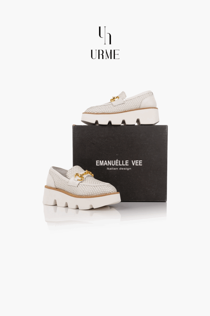 The Emanuélle Vee Woven Leather Lug-Sole Loafer blends summer ease with modern edge. Crafted in ivory woven leather and detailed with a gold horsebit, it sits on a chunky, lightweight platform sole for all-day comfort and lift. A chic, contemporary staple from SS23, perfect for effortless city looks.