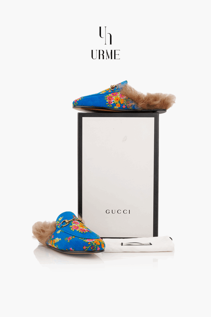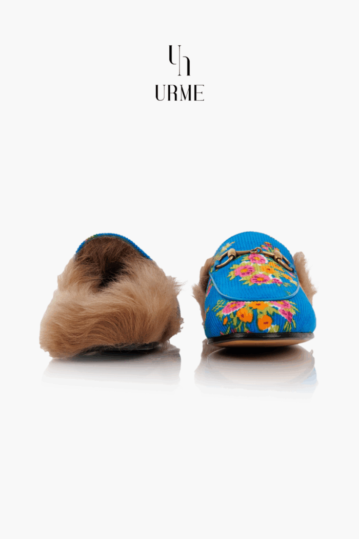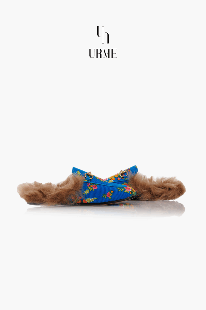 Gucci’s iconic Princetown mules reimagined in vivid blue floral jacquard and lined with plush natural shearling. The backless silhouette is finished with the house’s signature gold-tone horsebit and a slim, low heel for effortless wear.