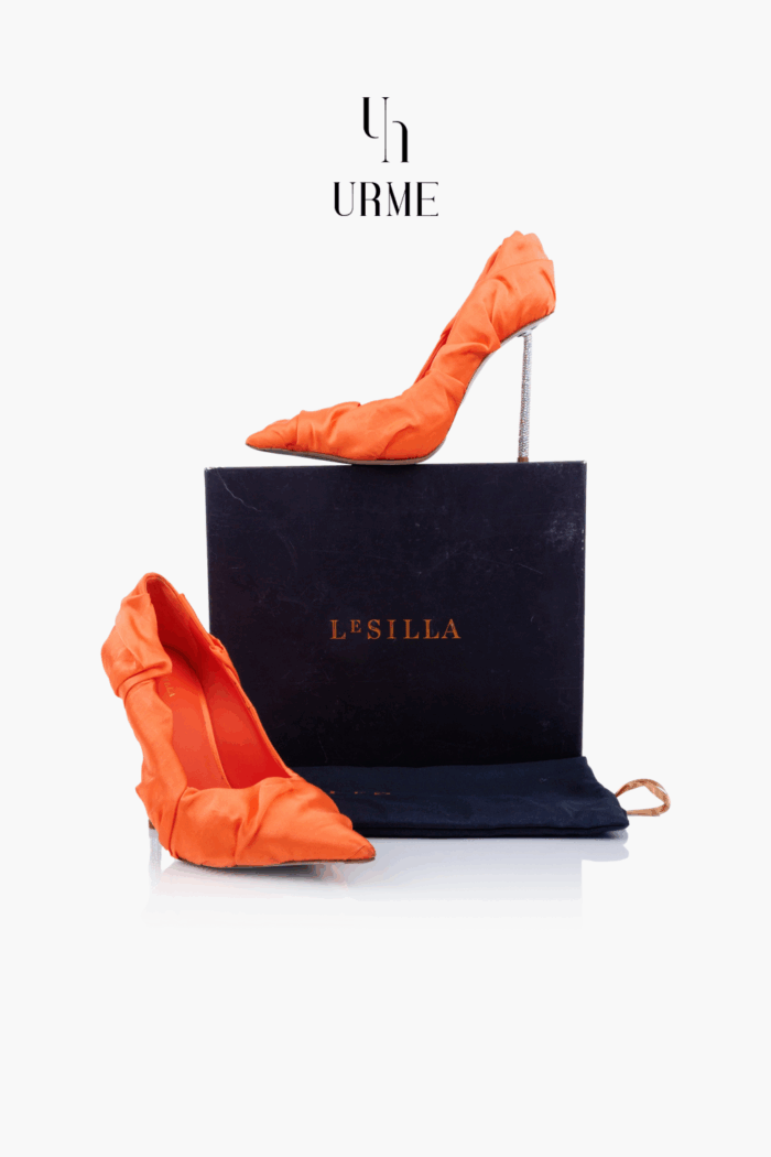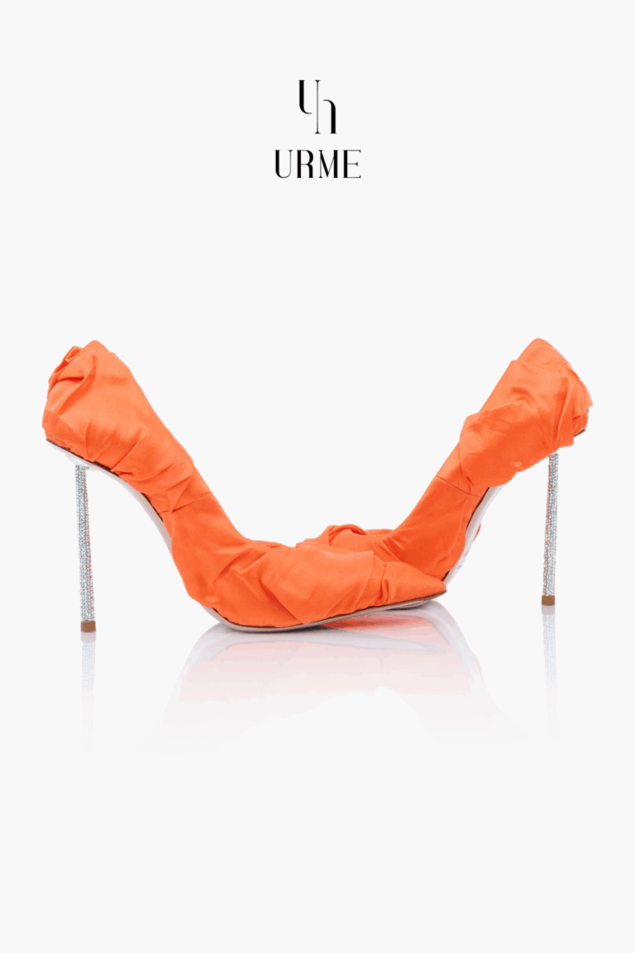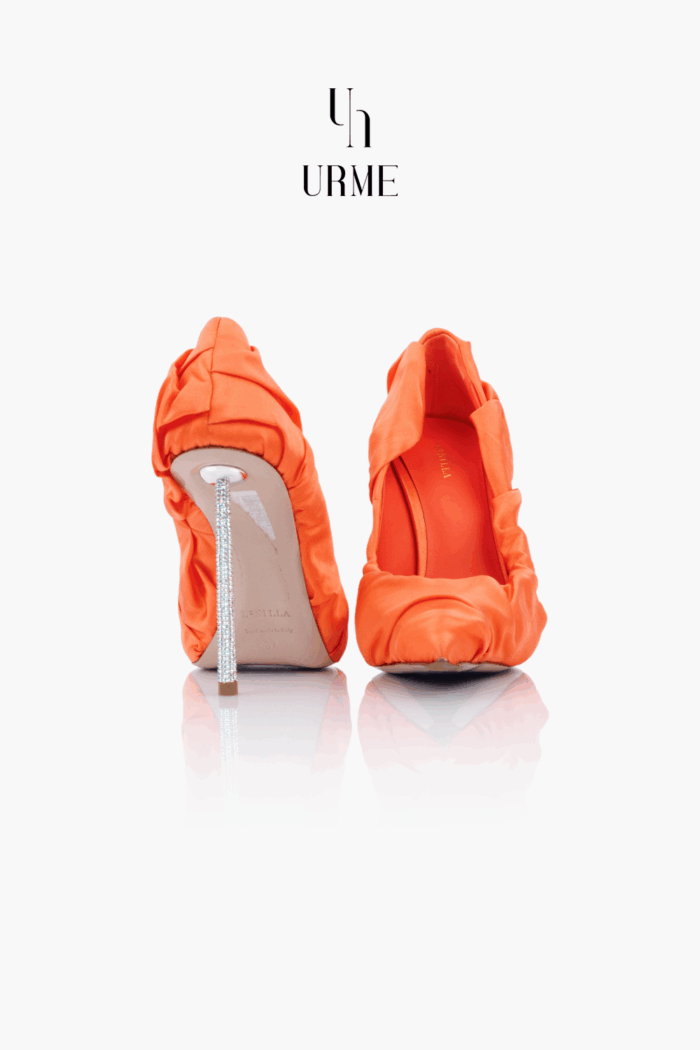 Vivid glamour for standout evenings. The Le Silla Fedra 120 Ruched Satin Pump arrives in radiant orange satin with artful ruched draping and a slim crystal-encrusted stiletto. A sharp pointed toe and leather lining refine the silhouette, while the 120 mm heel delivers dramatic lift—an eye-catching statement from SS22 crafted in Italy.