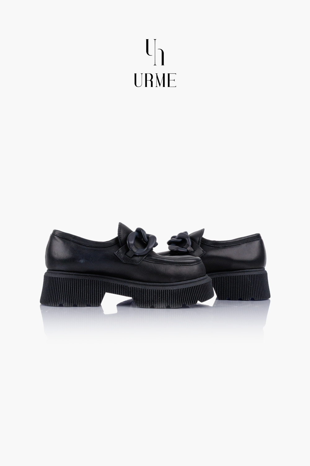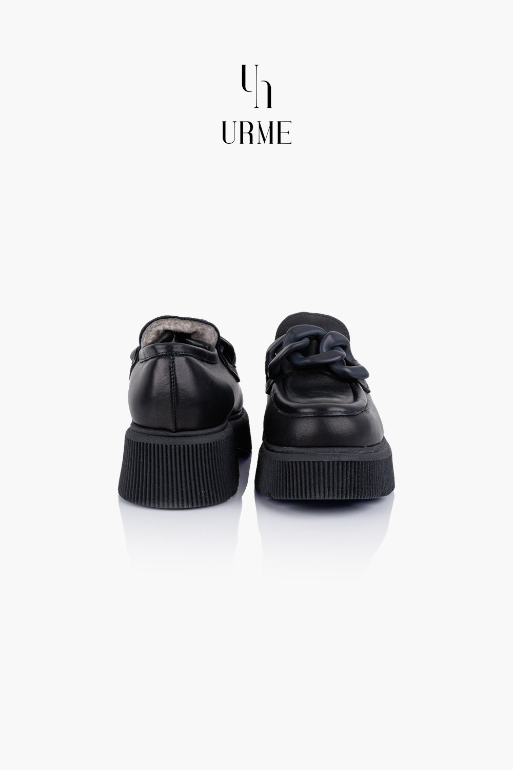 Chunky yet chic, these Nila & Nila loafers are crafted from smooth black leather and set on a rugged block platform. A matte oversized chain adds a modern edge, while the cozy faux-fur lining and leather insole keep them comfortable through colder days. A versatile city shoe with statement attitude.