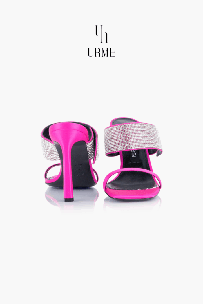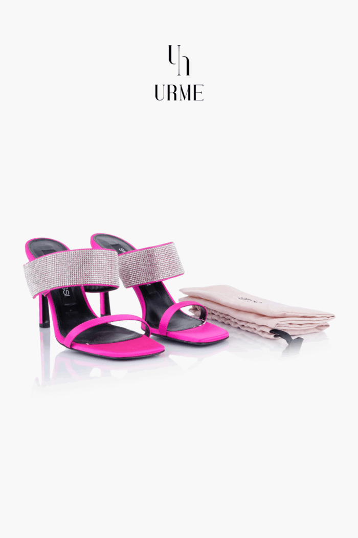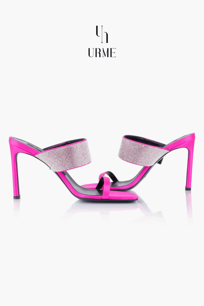 Crafted in Italy from luxurious fuchsia satin, the Sabot 95 Sandal by Sergio Rossi features a sleek 9.5 cm stiletto heel and a modern square toe. The wide front strap is fully embellished with micro-crystals, offering a refined sparkle. A leather insole ensures comfort, while the structured silhouette highlights elegance and precision. Part of the Spring-Summer 2023 collection, this mule is a standout piece for eveningwear or elevated day looks.