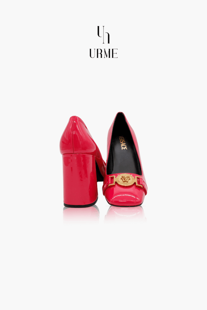 Gleaming and bold, these Versace pumps are crafted in high-shine patent leather in a vivid fuchsia. The clean pointed toe is crowned by a signature gold Medusa plaque, while the sturdy 90 mm block heel balances elegance with comfort. A striking, modern pump that delivers instant statement energy.